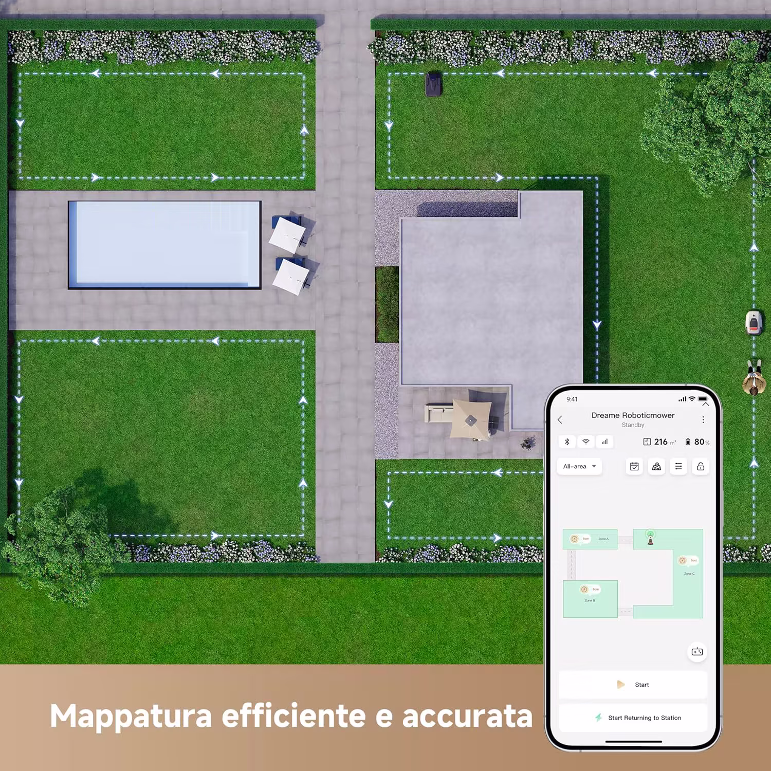 Il Dreame A1 Pro è il robot tosaerba ideale per giardini di grandi dimensioni, capace di coprire fino a 3.000 m² senza filo perimetrale. Il suo sistema di navigazione RTK ad alta precisione, combinato con l'intelligenza artificiale, assicura un taglio perfettamente uniforme su ogni centimetro del vostro prato.