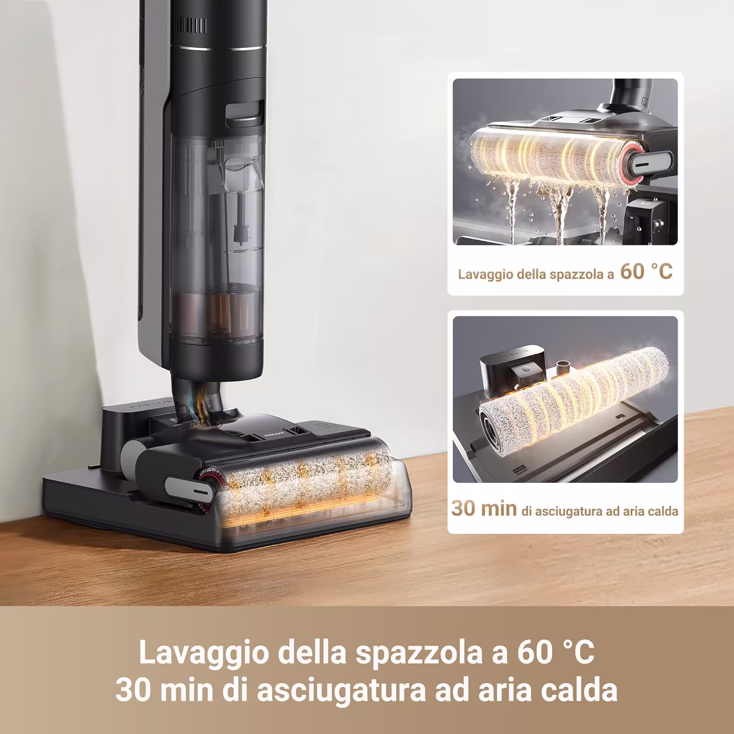 Il Dreame H12 Pro Ultra ridefinisce la pulizia dei pavimenti con una potenza di aspirazione di 18.000 Pa e un sistema a doppio rullo. Questo lavapavimenti senza fili combina aspirazione e lavaggio simultaneo per rimuovere polvere, macchie e sporco incrostato in un solo passaggio. La tecnologia di lavaggio ad acqua calda a 140°F scioglie i residui più ostinati, dalle tracce di grasso alle macchie di cibo secche.