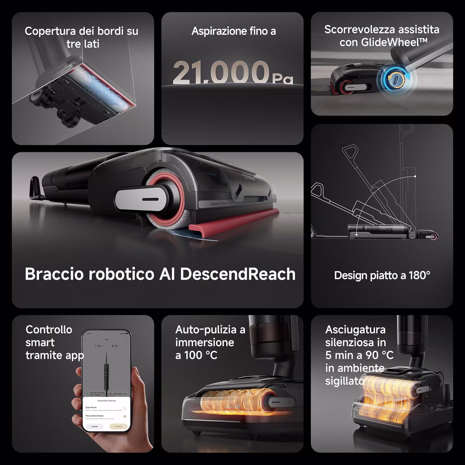 Il Dreame H15 Pro rivoluziona la pulizia dei pavimenti con il suo braccio robotico AI DescendReach GapFree e la copertura tripla dei bordi. Questa tecnologia raggiunge le zone piu difficili da raggiungere: sotto i mobili, lungo i battiscopa e in ogni angolo. Il design ultrapiatto a 180 gradi si adatta a qualsiasi configurazione d'interni. Con 21.000 Pa di aspirazione, cattura tutto lo sporco in un solo passaggio.