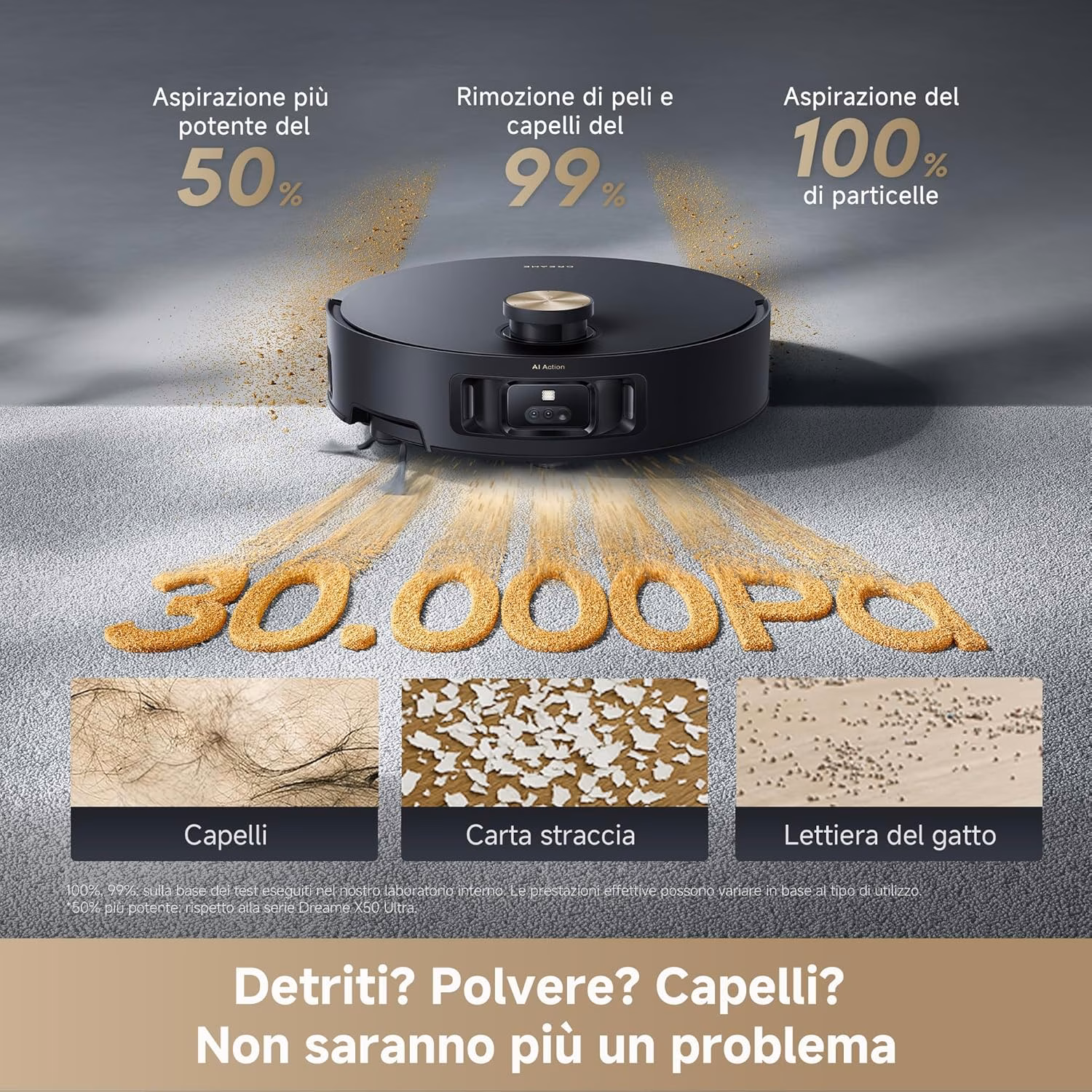 → 30.000 Pa di aspirazione — potenza identica al Matrix10 Ultra, superiore alle serie X (20.000 Pa) e L (13-18.000 Pa)