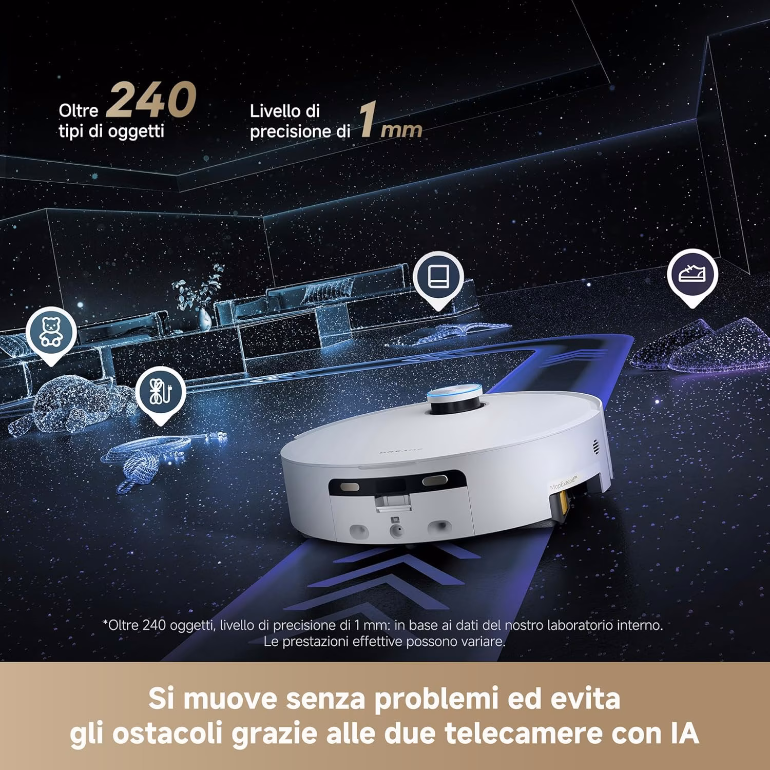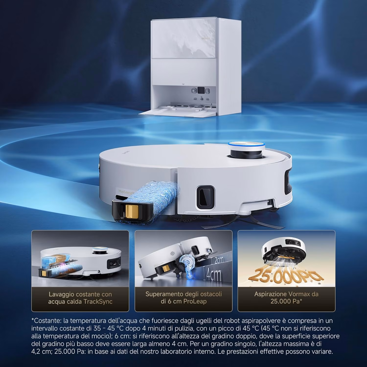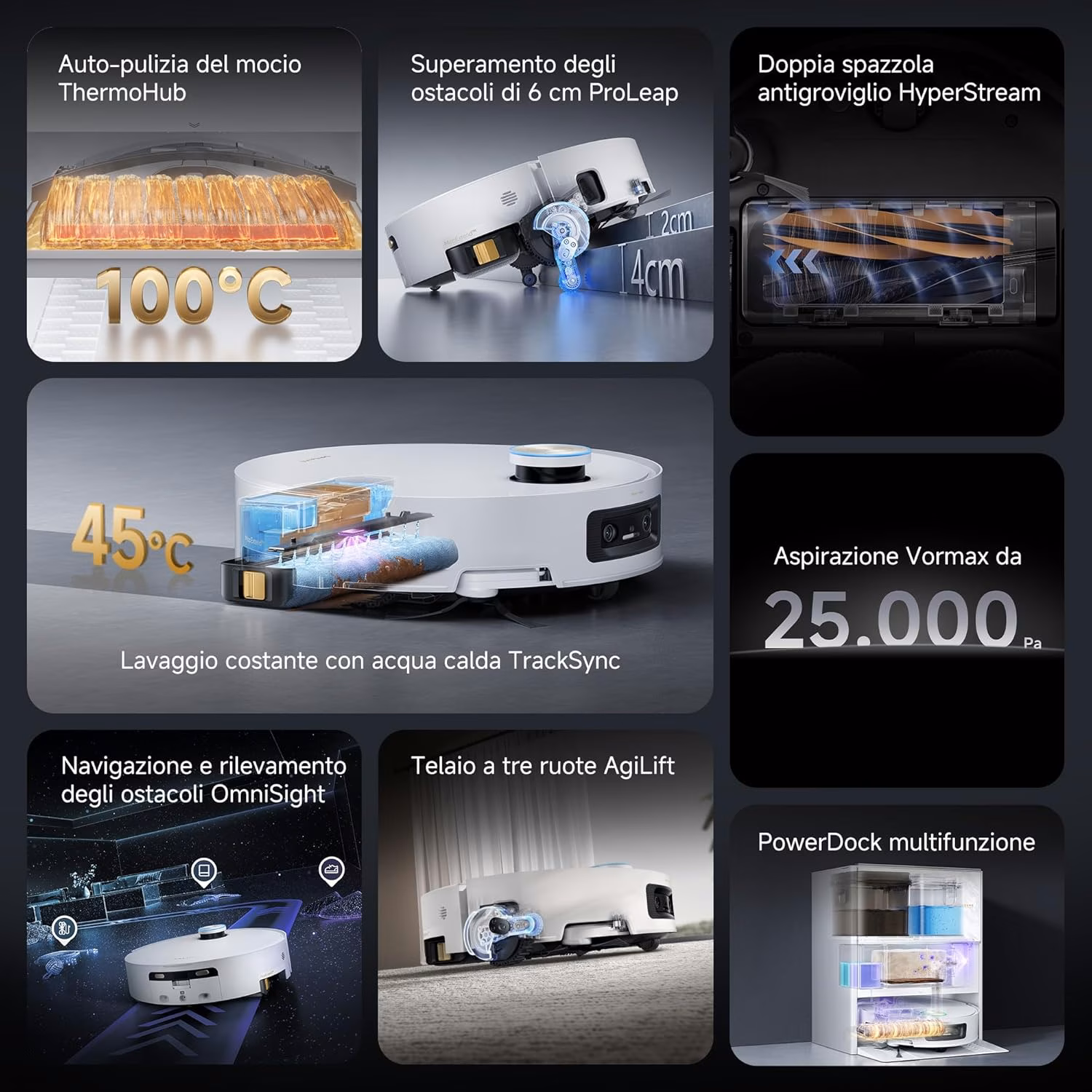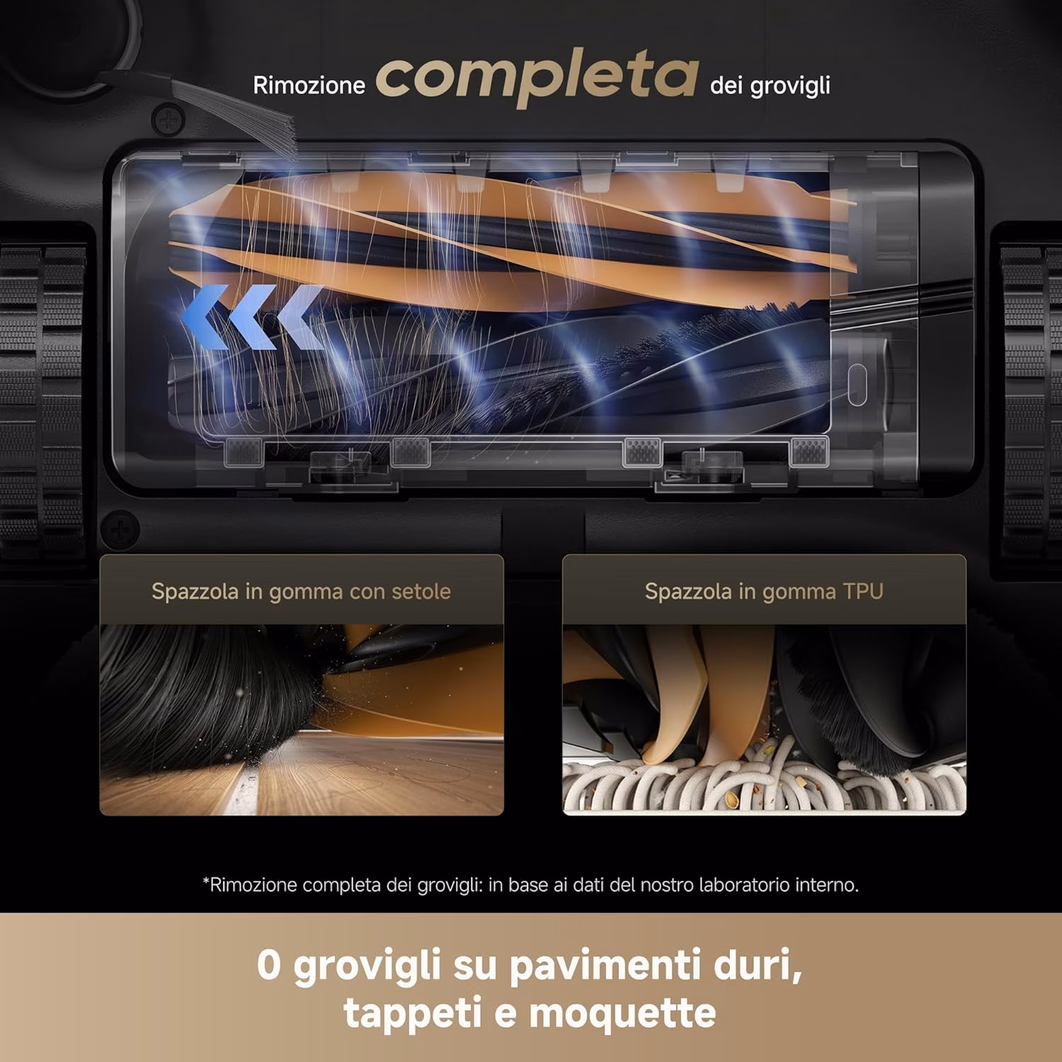 Spazzola HyperStream™ doppio materiale ed EasyLeap™ La spazzola HyperStream™ combina gomma e TPU per un'aspirazione di 25.000 Pa senza grovigli. I piedi robotici retrattili consentono di superare ostacoli fino a 60 mm, mentre EasyLeap™ gestisce le soglie fino a 40 mm con notevole facilita. Il mop si stacca o si solleva automaticamente all'avvicinarsi dei tappeti.
