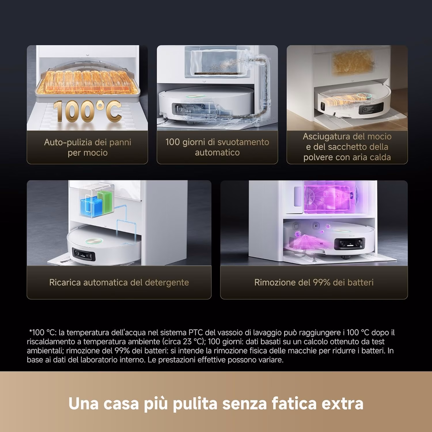 PowerDock™ 100°C — Svuotamento e ricarica automatici La stazione PowerDock™ lava il cingolo a 100°C per una disinfezione totale, asciuga con aria calda e svuota il contenitore della polvere automaticamente per 100 giorni. Ricarica anche acqua e soluzione detergente automaticamente. Zero interventi per settimane intere.