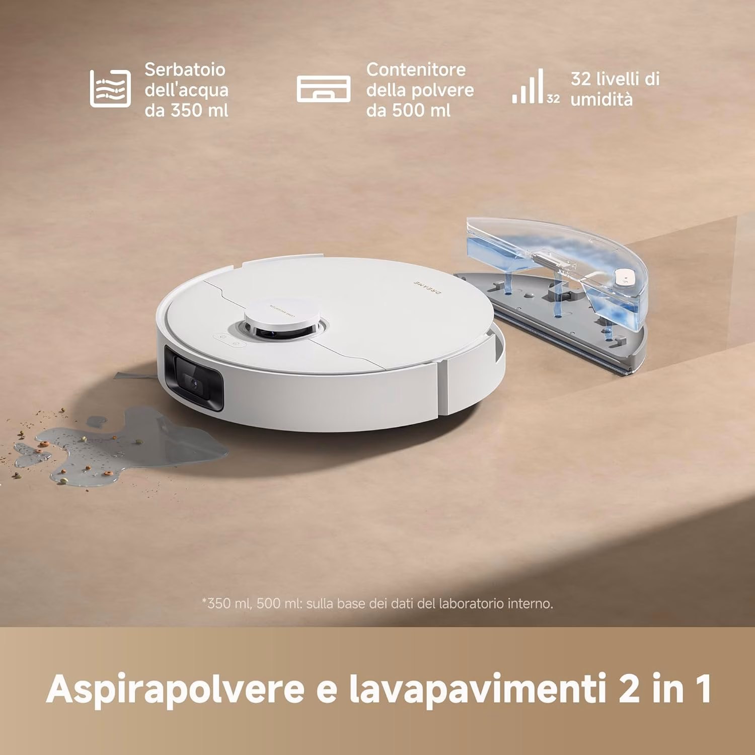 Lavaggio 2-in-1 con 32 regolazioni di umidità Il serbatoio da 350 ml di acqua pulita alimenta un panno la cui umidità è regolabile su 32 livelli tramite l'app. Da una passata leggermente umida a un lavaggio più intenso, potete adattare la pulizia ad ogni stanza e tipo di pavimento.
