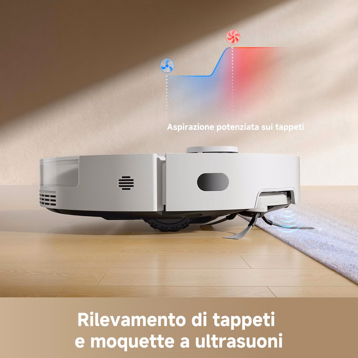 13.000 Pa Vormax + spazzola HyperStream anti-groviglio Il motore Vormax eroga 13.000 Pa di aspirazione, ampiamente sufficienti per raccogliere polvere fine, peli di animali, briciole e sabbia su tutti i tipi di pavimento. La doppia spazzola HyperStream impedisce ai capelli di attorcigliarsi, riducendo drasticamente la manutenzione. La spazzola laterale estensibile raggiunge angoli e battiscopa, mentre il sensore IR di bordo si avvicina a soli 2 mm dalle pareti per una copertura senza punti ciechi.