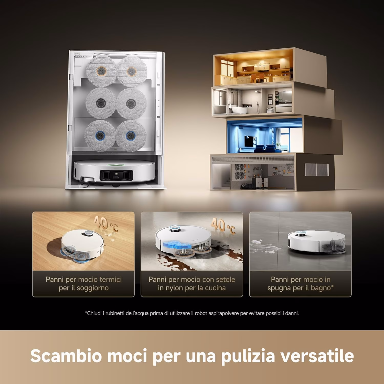 Il Dreame Matrix10 Ultra inaugura la serie Matrix con un obiettivo chiaro: ripensare tutto da zero. Con 30.000 Pa di aspirazione, un sistema multi-mop intercambiabile e superamento ostacoli di 80 mm, ridefinisce cio che un robot aspirapolvere puo fare. La stazione ThermoHub™ lava i panni a 100°C per un'igiene di livello ospedaliero.