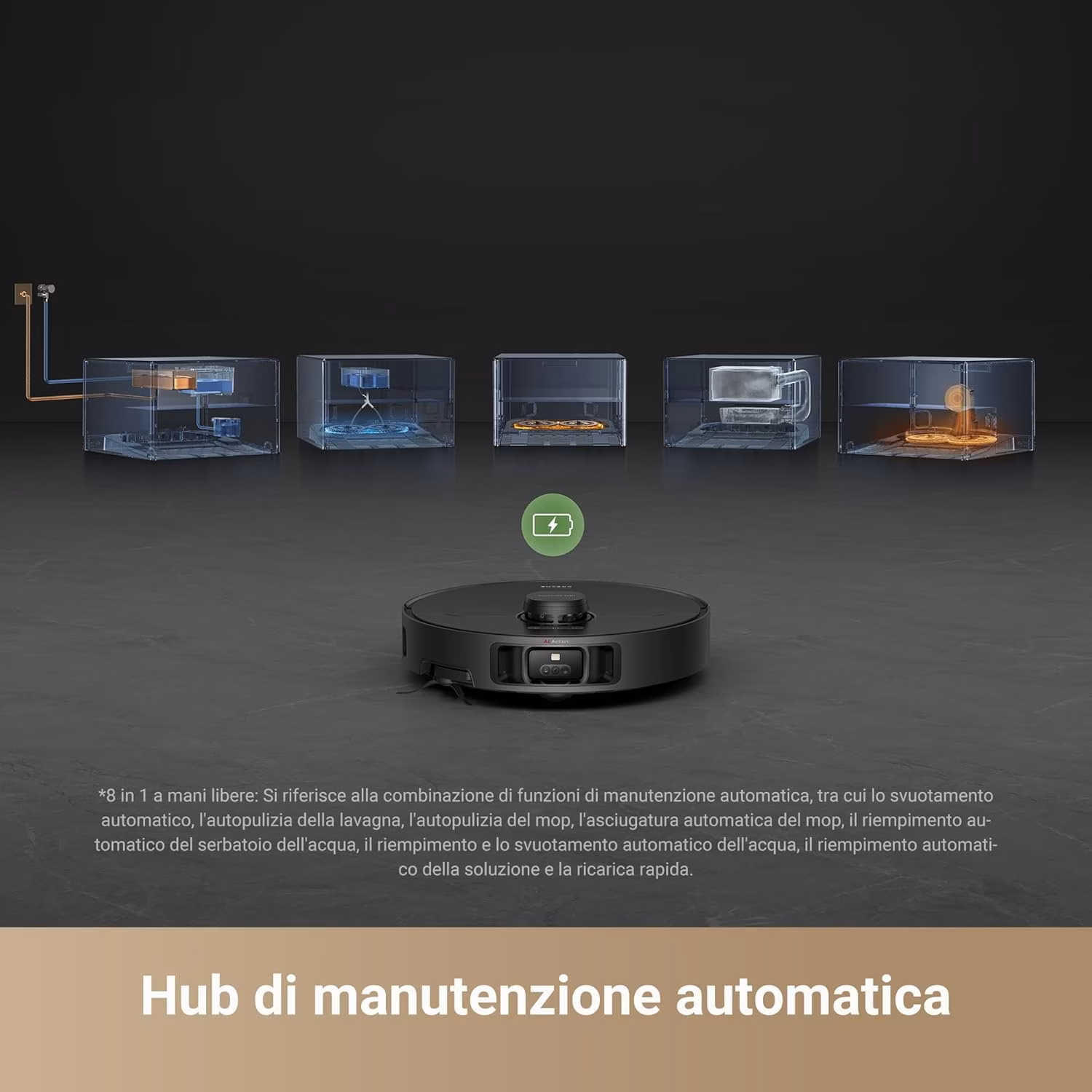Stazione 8-in-1 con gestione automatica dell'acqua La stazione compatta da 28 cm integra 8 funzioni: svuotamento automatico 90 giorni, lavaggio moci ad acqua calda 158°F, asciugatura ad aria calda, riempimento e svuotamento automatici dell'acqua. Collegatela all'impianto idrico e dimenticatela. L'X40 Master gestisce l'intero ciclo di pulizia e manutenzione da solo, giorno dopo giorno.