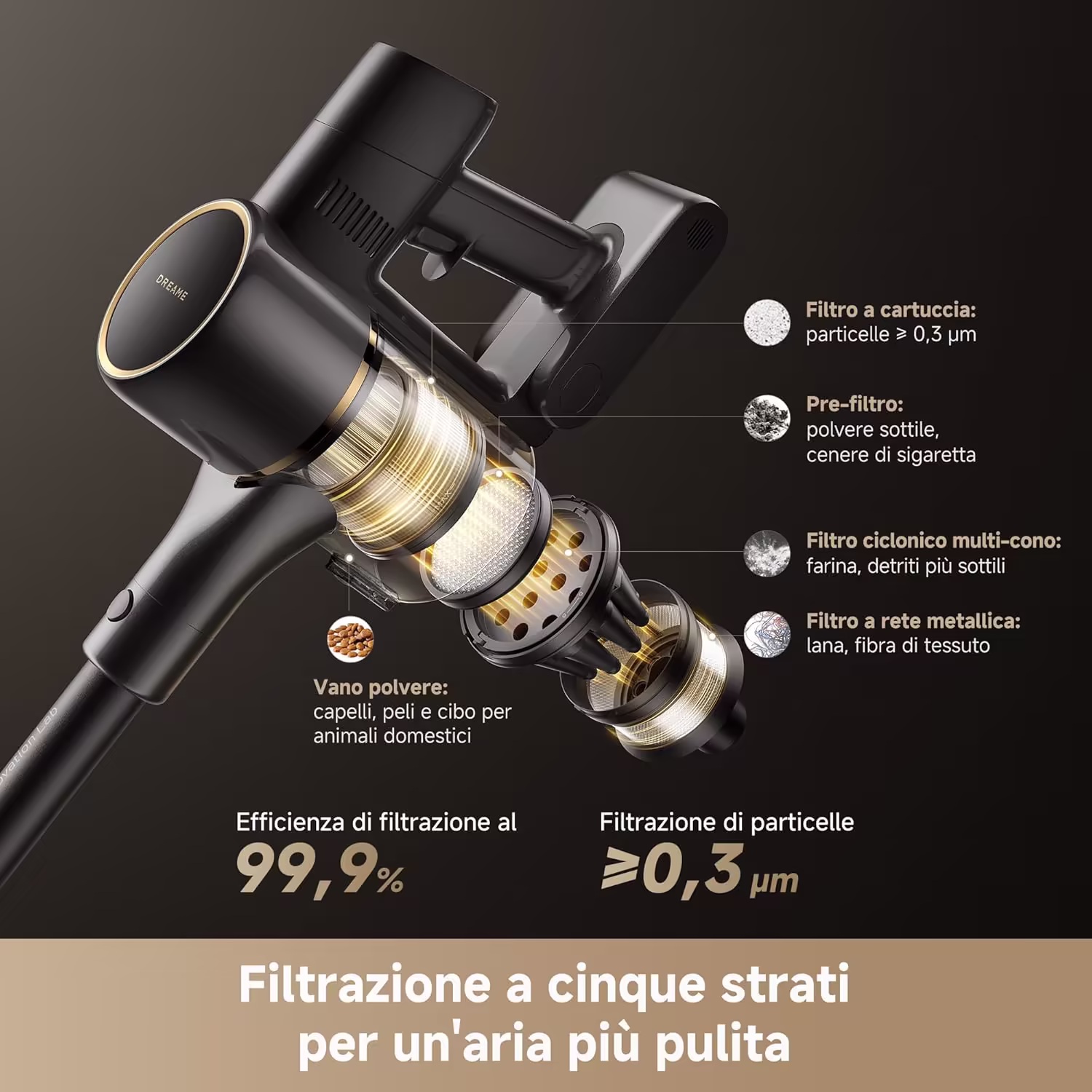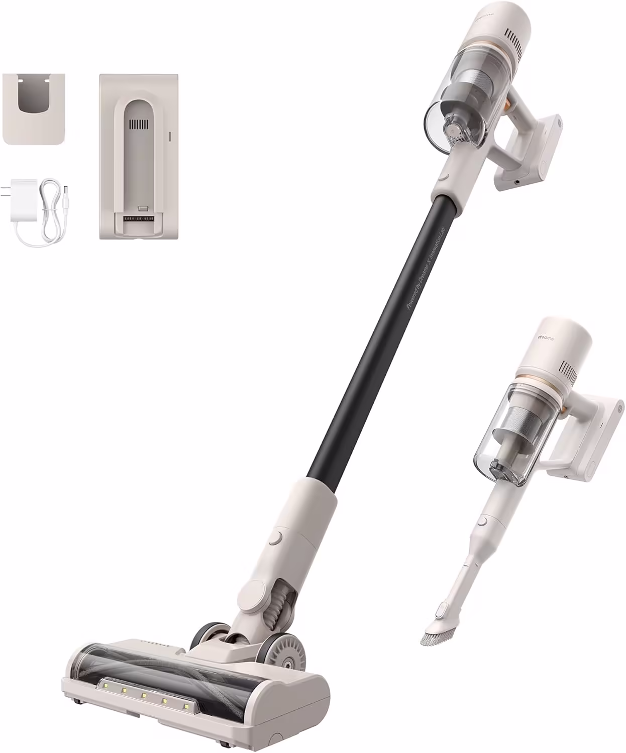 Il Dreame R20 SE-A e un aspirapolvere a bastone senza fili che unisce potenza e resistenza. Il suo motore da 150 AW (20.000 Pa) abbinato a un sistema avanzato a 12 cicloni garantisce un'aspirazione costante senza perdita di potenza, anche quando il contenitore si riempie. Il sistema ciclonico separa efficacemente le particelle dal flusso d'aria, prevenendo ogni intasamento del filtro. Con 90 minuti di autonomia in modalita Eco, il R20 SE-A copre senza difficolta grandi superfici, dalle case a piu piani agli appartamenti spaziosi.