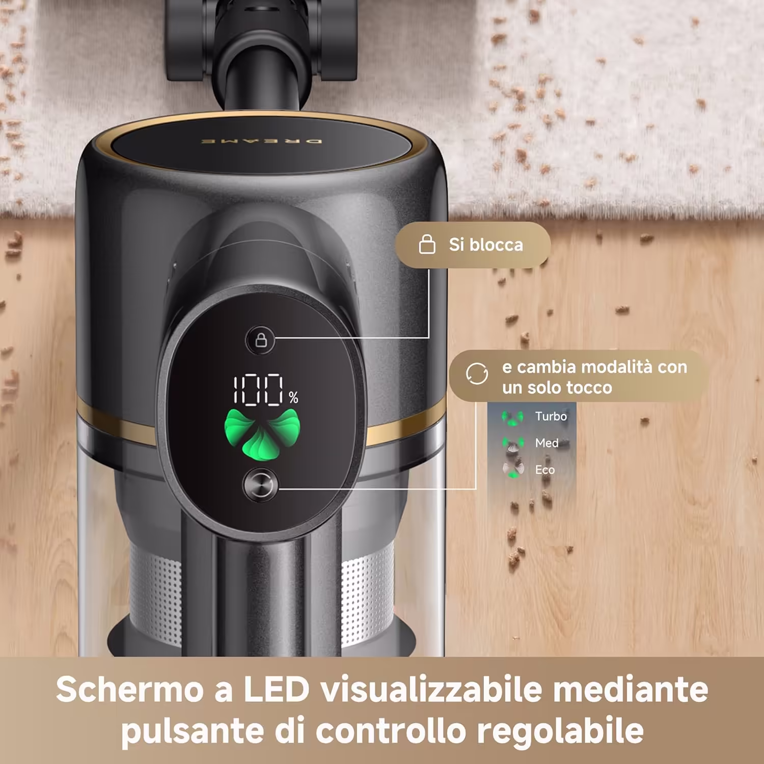 Il display LED intelligente del R20 SE-A mostra in tempo reale il livello della batteria, la modalita di aspirazione attiva e gli avvisi di manutenzione, per un controllo totale in ogni momento. L'apparecchio si distingue anche per la pulizia continua a pressione singola: non serve tenere premuto il grilletto. Il R20 SE-A aspira in continuazione finche non lo si spegne, riducendo l'affaticamento della mano durante le lunghe sessioni di pulizia.