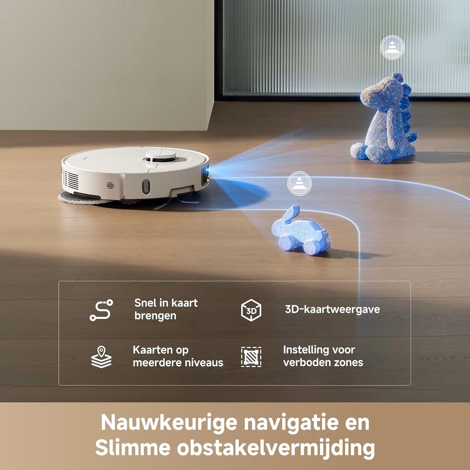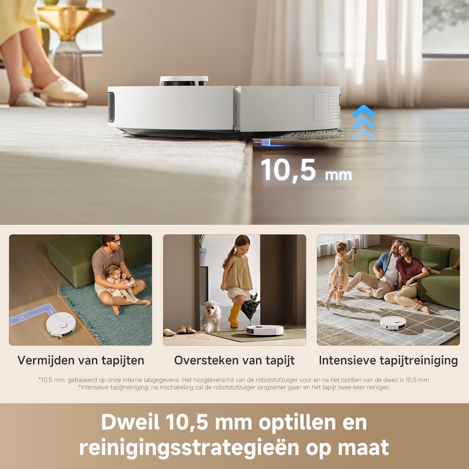 De Dreame L10s Ultra Gen 3 zet een nieuwe standaard in zijn klasse met 25.000 Pa zuigkracht over 5 instelbare niveaus. Deze uitzonderlijke zuigkracht vangt fijn stof, kruimels, dierenharen en diep in tapijtvezels ingebedde deeltjes op. De uitschuifbare intrekbare zijborstel en uitschuifbare mop bereiken hoeken en randen die standaard robots simpelweg missen.