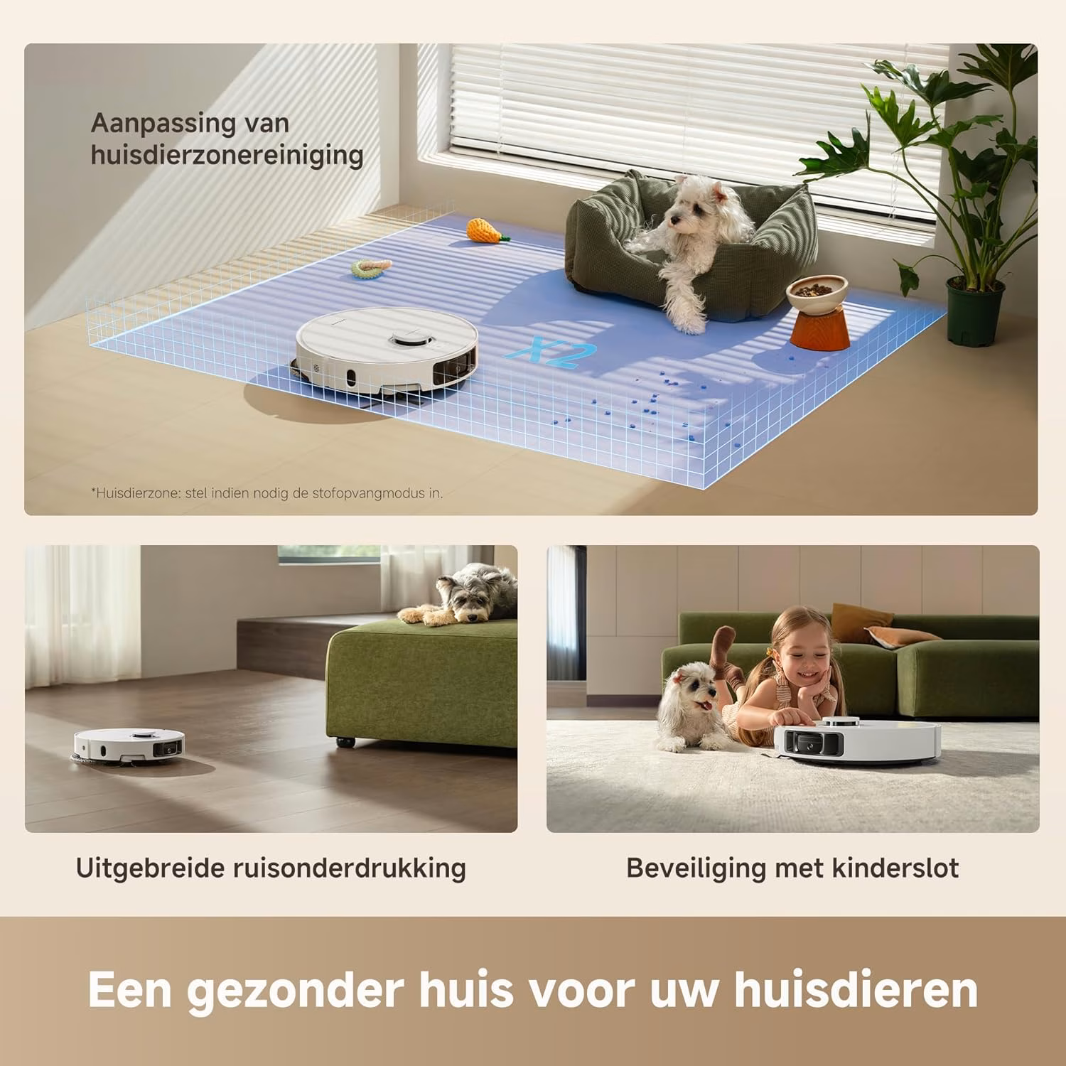 Het zelfreinigende basisstation verzorgt automatisch plaatwassen, mopwassen, zelfontlediging tot 100 dagen, heteluchtdroging en automatisch bijvullen van water en reinigingsmiddel. De 30% snellere oplaadtijd en ondersteuning voor daluren-laden helpen uw elektriciteitskosten te verlagen terwijl de robot altijd klaar staat voor gebruik.