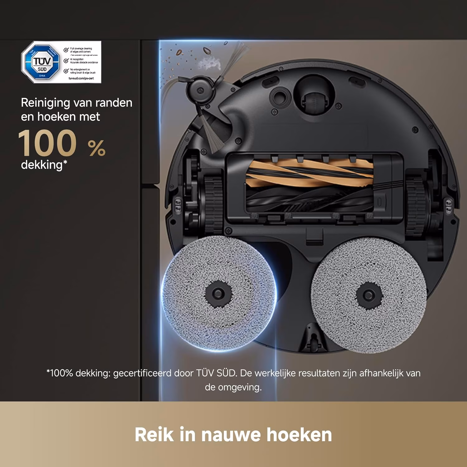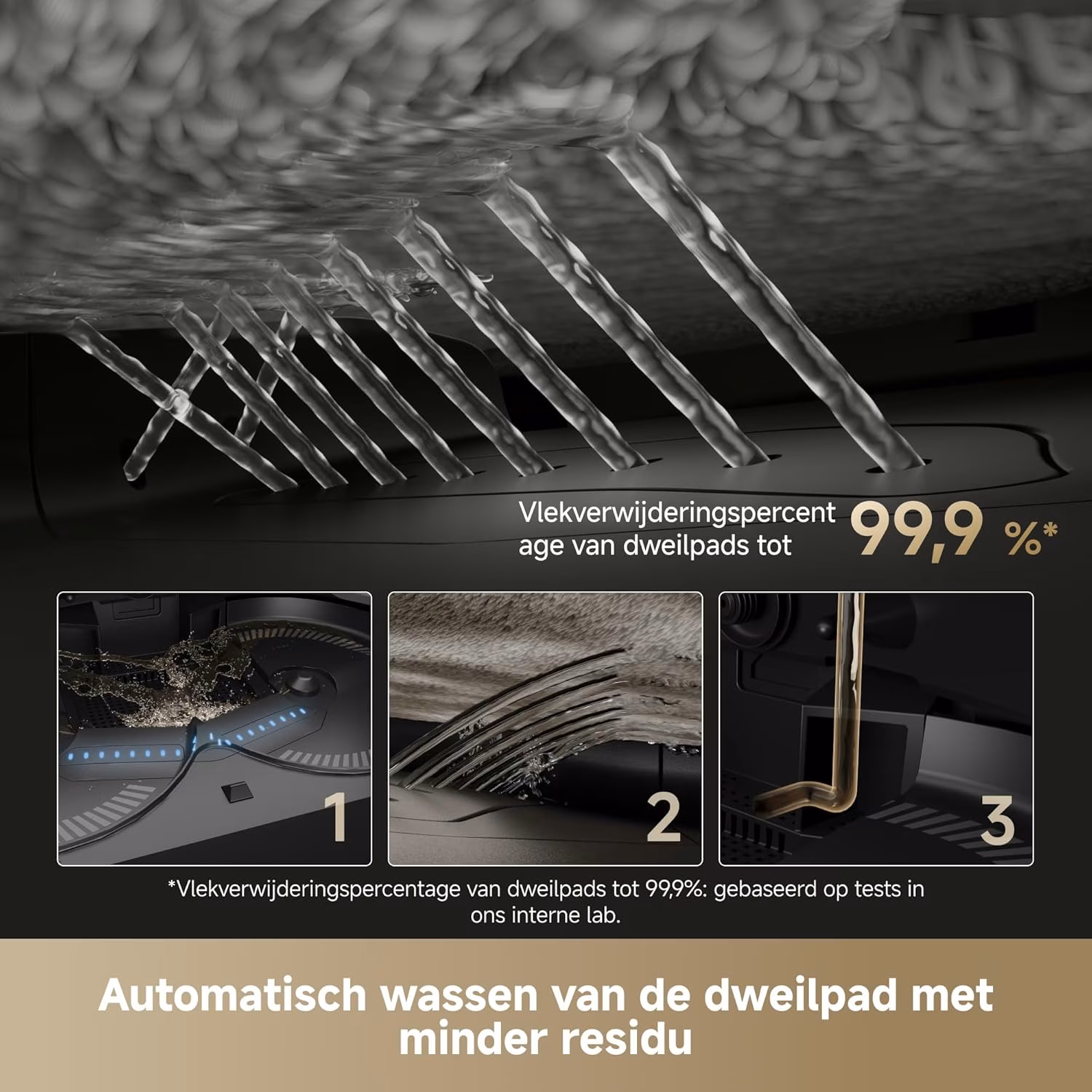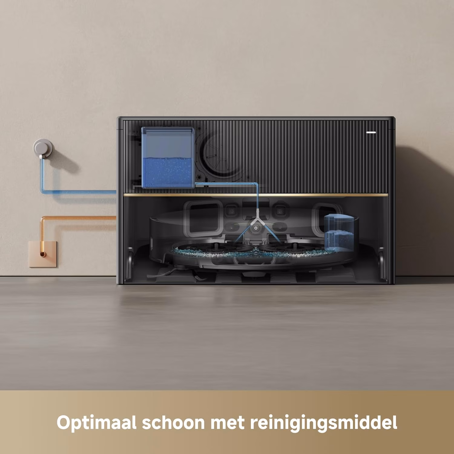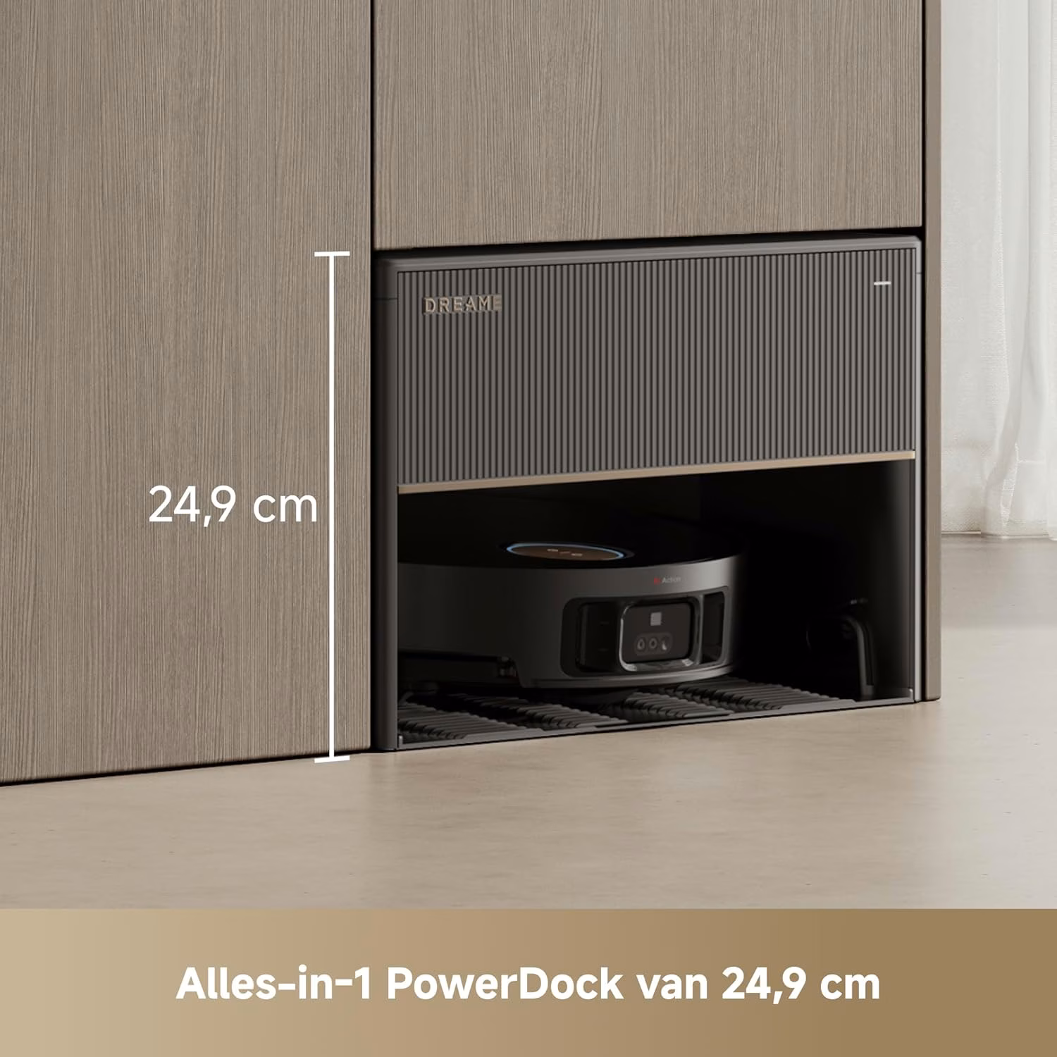 PowerDock 8-in-1 UV — Compact station, maximale functies Het PowerDock 8-in-1 station is met slechts 24,9 cm breed het meest compacte dockingstation op de markt voor dit functieniveau. Het biedt 100 dagen automatisch legen, 176°F warm water moppen wassen, heteluchtdroging, UV-sterilisatie, automatisch water bijvullen en automatisch schoonmaakmiddel doseren. Vijf tapijtmodi passen de zuigkracht aan op elk textieloppervlak.