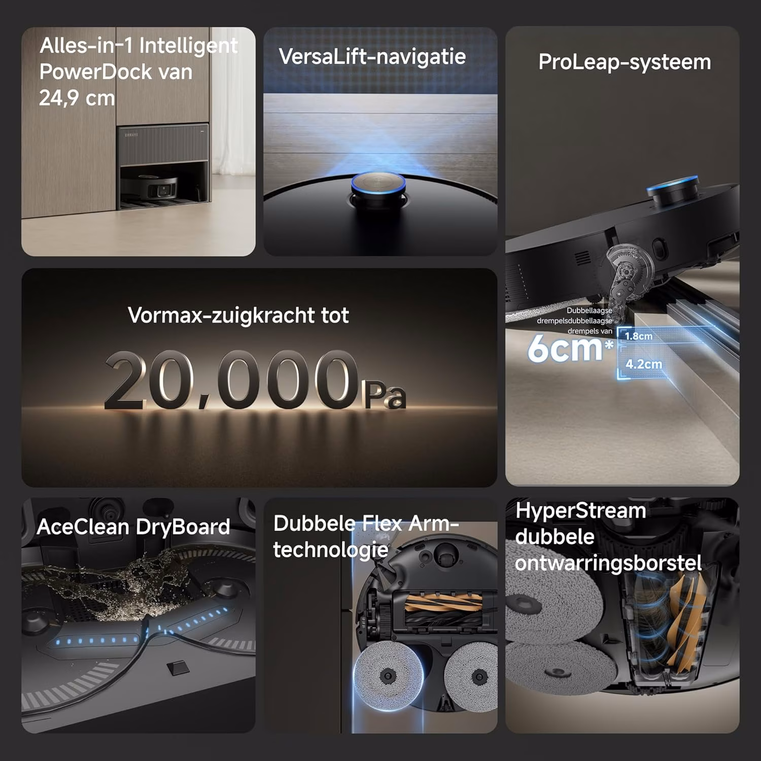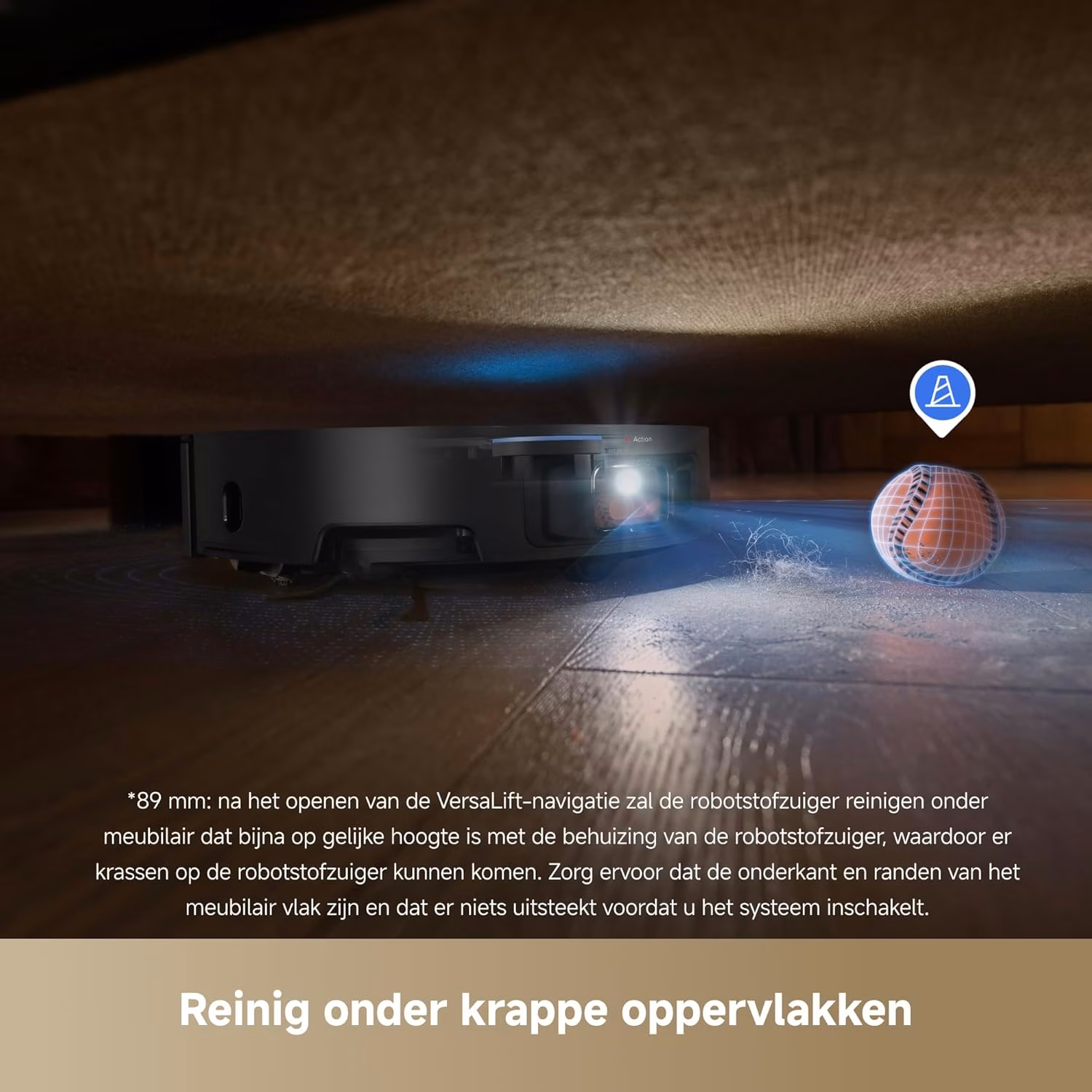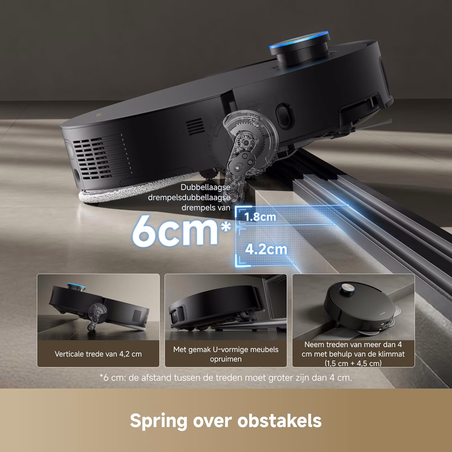 De Dreame X50 Master verlegt de grenzen van premium robotstofzuigen. Met 20.000 Pa Vormax-zuigkracht aangedreven door de TurboForce-motor, een ultracompact basisstation van slechts 24,9 cm en het 60 mm ProLeap-klimsysteem staat hij aan de top van Dreames assortiment. De VersaLift-navigatie met intrekbare sensoren en 3DAdapt AI die meer dan 200 objecten herkent zorgen voor intelligente en nauwkeurige reiniging.