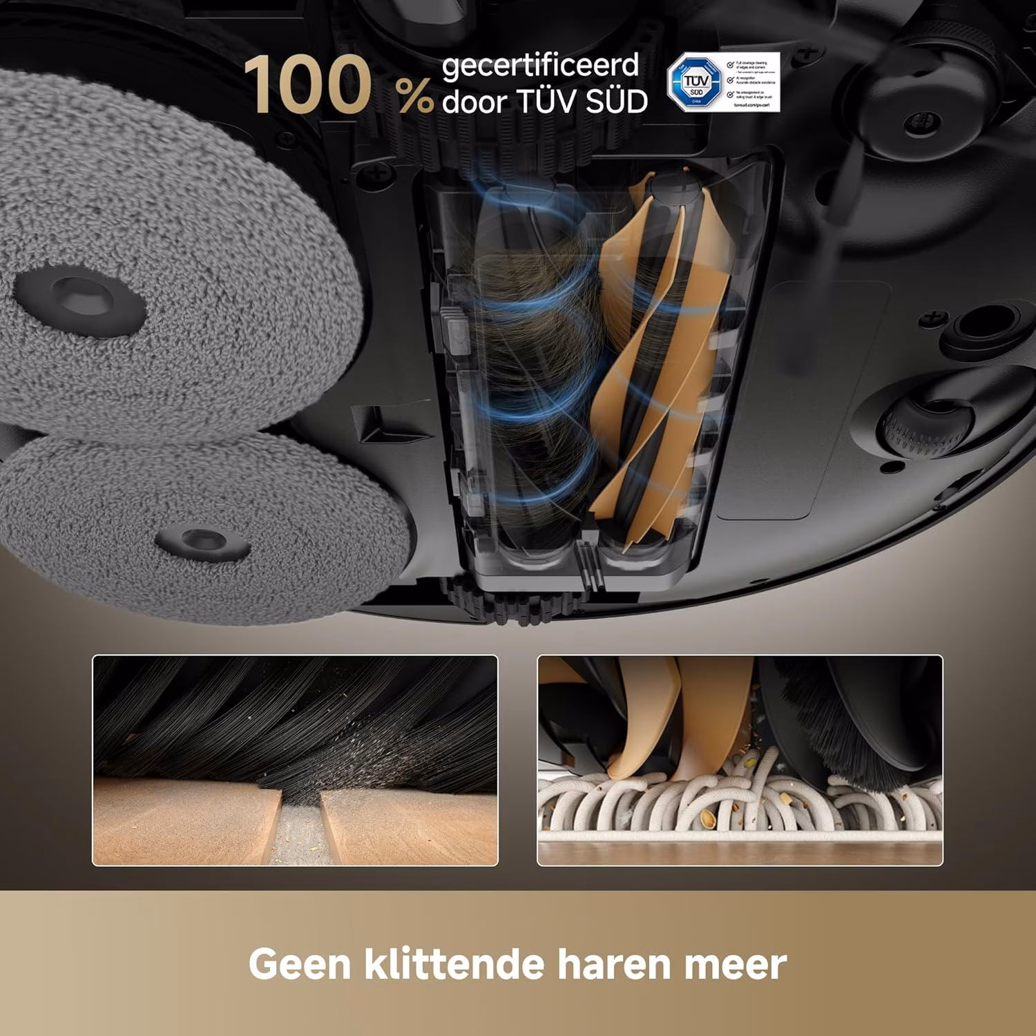 HyperStream Dubbel Anti-Klit — Haar tot 30 cm De HyperStream dubbele anti-klitborstel is ontworpen om haar tot 30 cm lang te verwerken zonder ooit te verstrengelen. Geen handmatig borstels schoonmaken meer: de X50 Master verwerkt dierenhaar en mensenhaar zonder onderhoud. De dubbele flexibele arm schuift zowel de zijborstel als de dweilpad uit om hoeken en randen met opmerkelijke precisie te bereiken.
