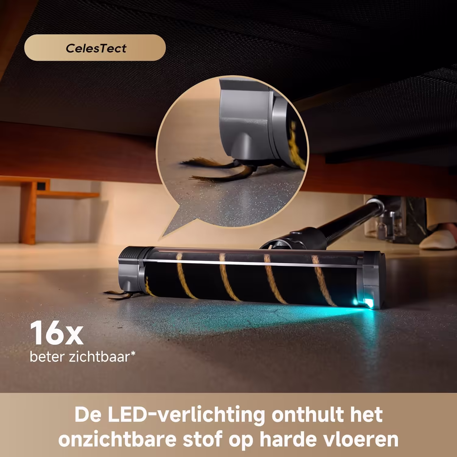 De R30 beschikt over een slim vuildetectiesysteem dat de zuigkracht automatisch aanpast op basis van het gedetecteerde vuilniveau. De CelesTect multisurface-borstel met ingebouwde LED verlicht deeltjes die onzichtbaar zijn voor het blote oog, terwijl de V-vormige borstelharen de opname op alle vloertypes optimaliseren. De geintegreerde anti-klit kam voorkomt dat haar om de rol wikkelt, waardoor het onderhoud tot een minimum beperkt blijft.