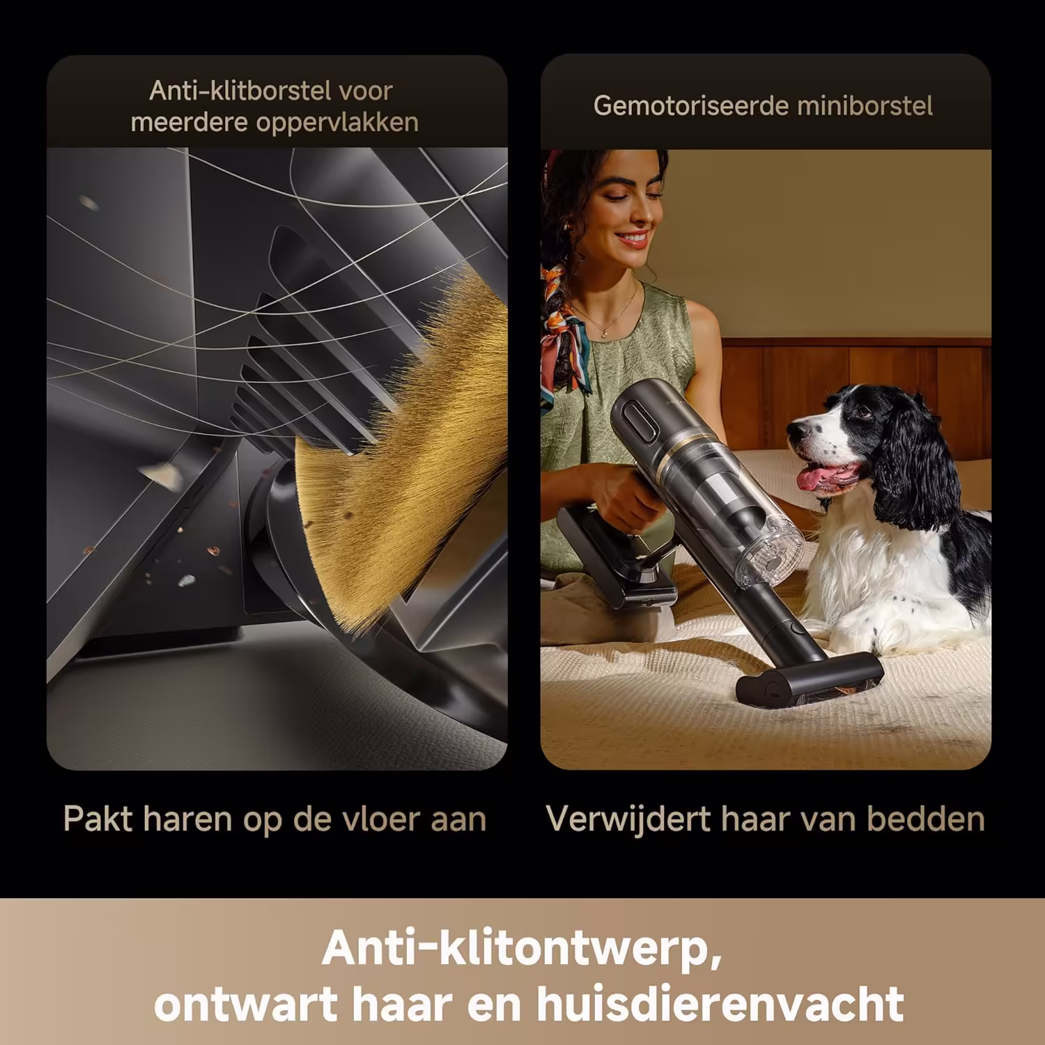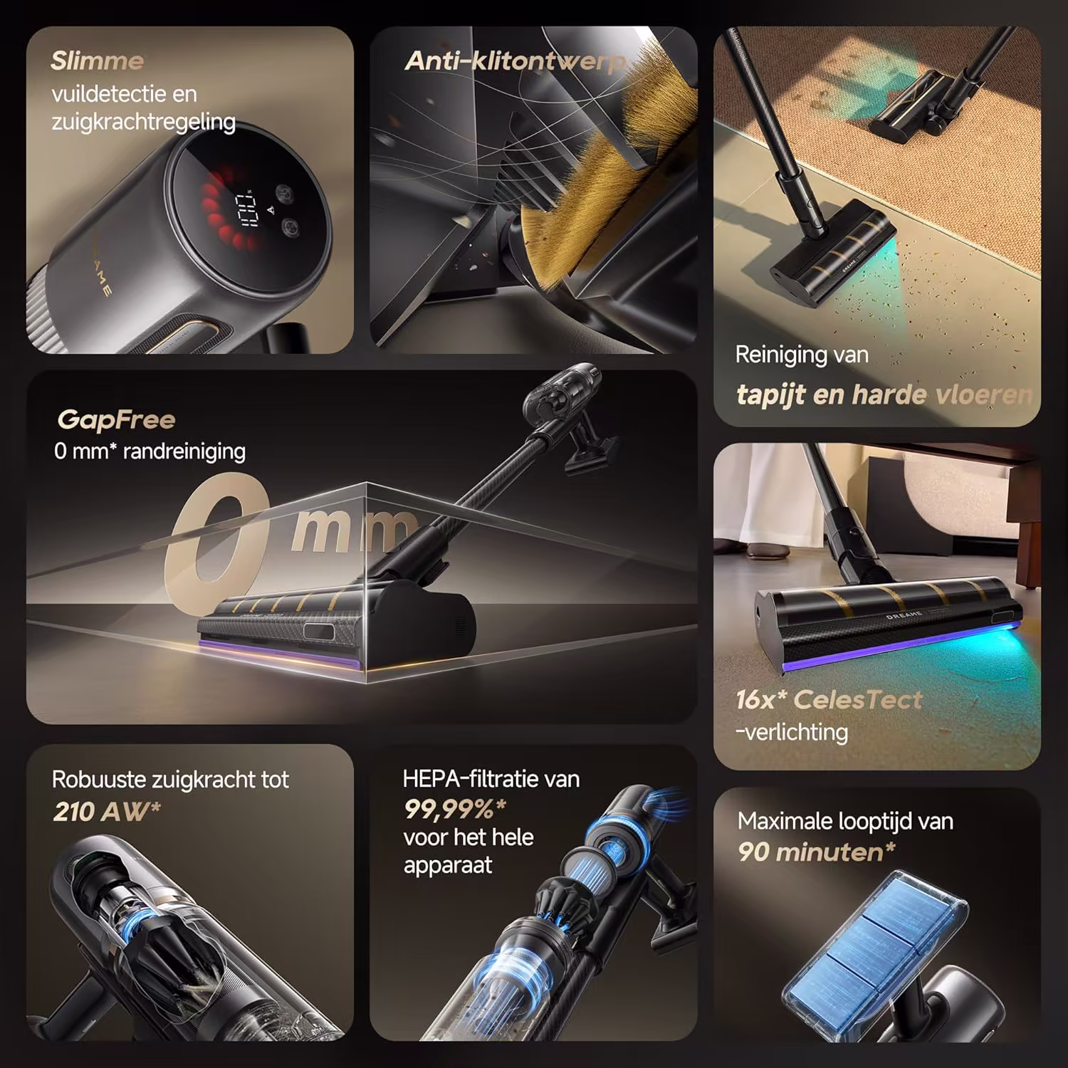Met 25.000 Pa en 210 AW zuigkracht van een borstelloze motor levert de Dreame V20 sterke prestaties op alle oppervlakken. De multisurface CelesTect LED-borstel met V-vormige haren heeft een geintegreerde anti-klit kam die voorkomt dat haar en dierenhaar zich om de rol wikkelt. Dit ingenieuze ontwerp wordt bijzonder gewaardeerd in huishoudens met huisdieren of personen met lang haar, omdat het handmatig reinigen van de borstel overbodig maakt.