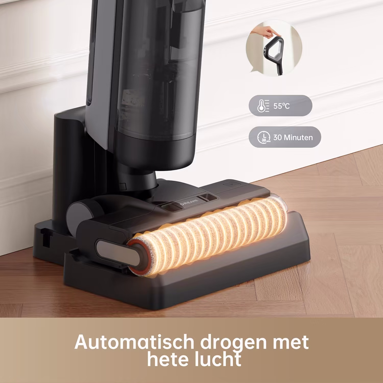 Na elk gebruik start de H12 Dual een zelfreinigingscyclus met een druk op de knop, waarbij de borstel wordt gespoeld met schoon water. De heteluchtdroging op 55°C gedurende 30 minuten verwijdert restvocht en voorkomt de vorming van bacterien en schimmel in de borstelvezels. Met 60 minuten looptijd dekt de H12 Dual moeiteloos grote oppervlakken — een betrouwbare metgezel voor gezinnen en ruime woningen.