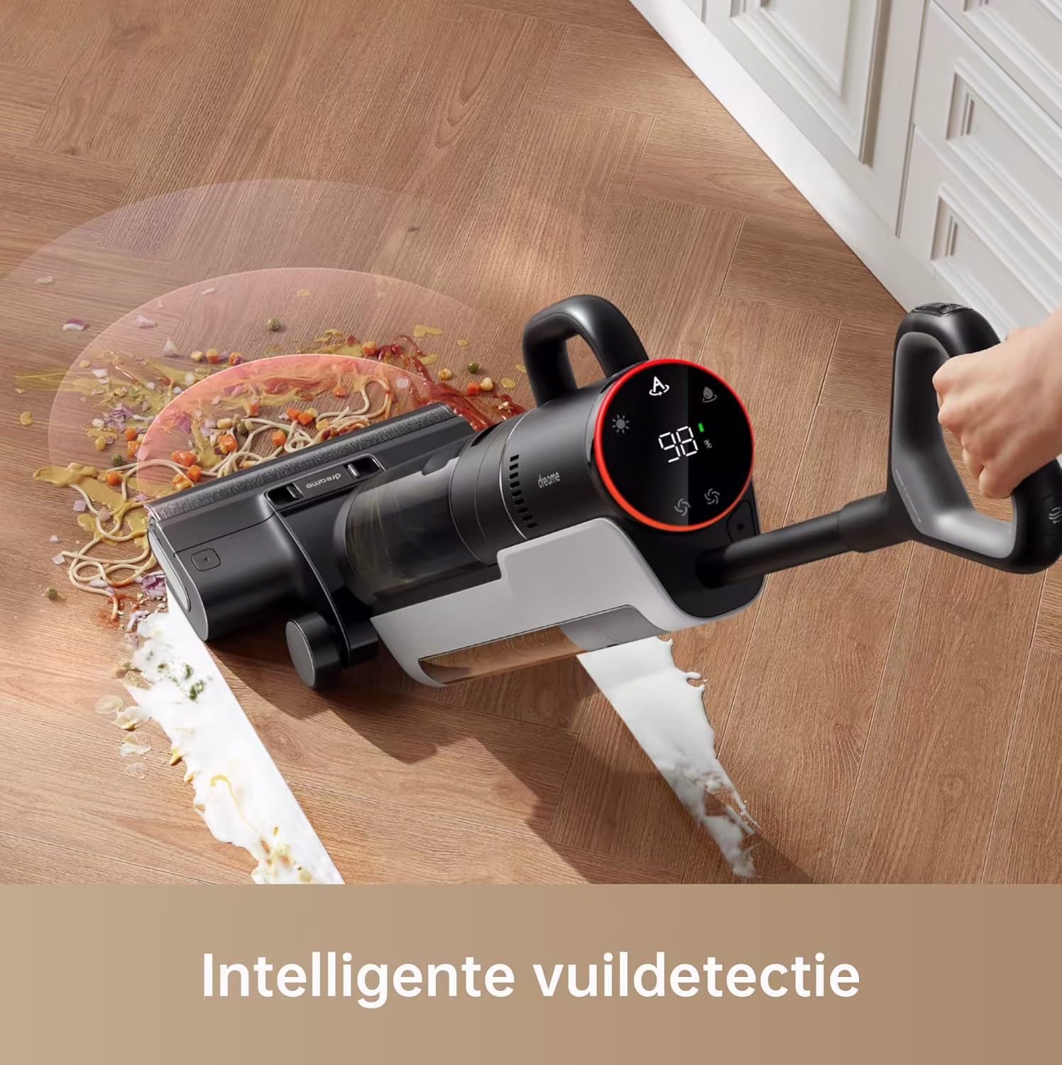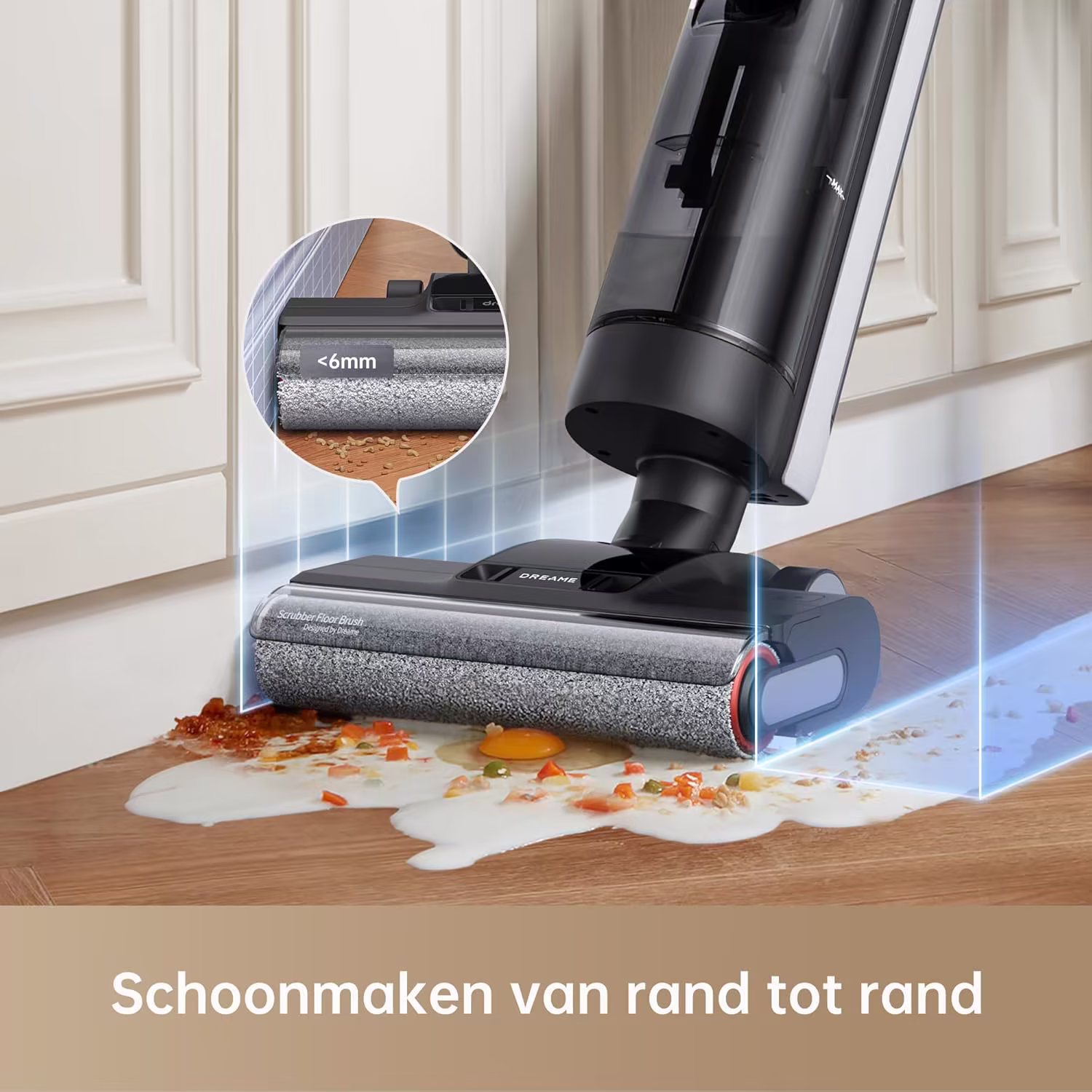 De Dreame H12 Dual onderscheidt zich door zijn uitzonderlijke veelzijdigheid. Het is niet zomaar een vloerreiniger, maar een compleet 4-in-1 reinigingssysteem dat droog zuigen, nat dweilen, handzuigen en slangmodus combineert. Of u nu keukentegels moet reinigen, kruimels van de bank wilt zuigen of lastig bereikbare plekken moet aanpakken, de H12 Dual lost elke taak op zonder van apparaat te wisselen. De verbeterde dubbele randborstel komt tot op 6 mm van de plinten, waardoor vuil wordt verwijderd waar gewone stofzuigers falen.