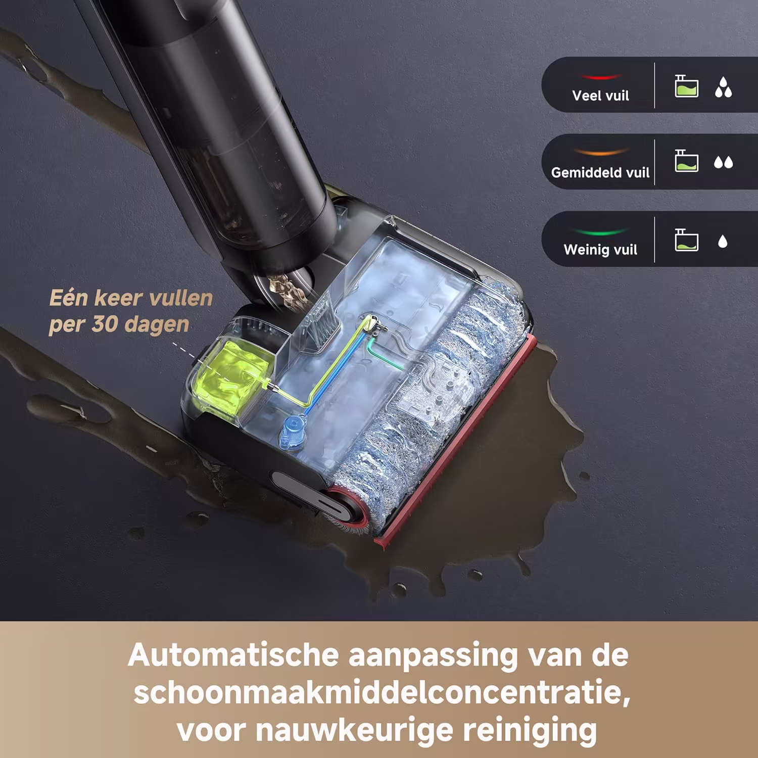 De Dreame H15 Pro FoamWash introduceert een geheel nieuwe technologie bij Dreame: geconcentreerde schuimreiniging. In tegenstelling tot traditionele vloerreinigers die alleen water gebruiken, genereert de FoamWash een dicht, actief schuim dat diep in de porieen van de vloer dringt om de hardnekkigste vlekken los te weken. Het verwijdert 100% van de huisdiervlekken en neutraliseert 99% van de geuren โ een doorslaggevend voordeel voor huishoudens met honden of katten.