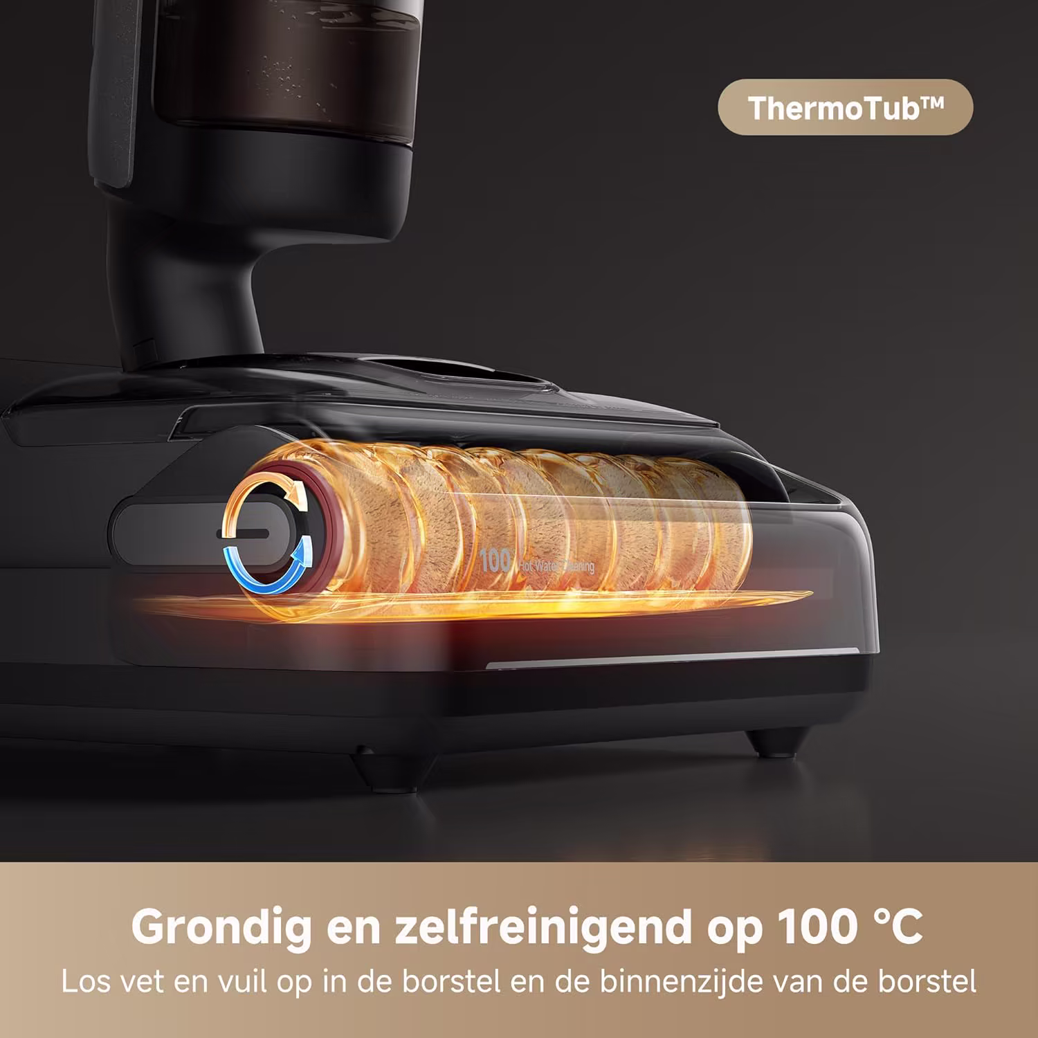 Na elk gebruik reinigt de H15 Pro zijn roller automatisch door volledige onderdompeling in 100 graden C heet water, waardoor 99,9% van de bacterien wordt geelimineerd. De dubbele droogmodus biedt twee opties: sneldroging bij 90 graden C in slechts 5 minuten voor direct hergebruik, of verlengde droging voor maximale hygiene. De veerkrachtige TangleCut-schraper voorkomt verstrengeling van haar en dierenhaar.